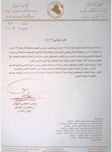 وثيقة تتضمن إحالة النائب مصطفى سند الى لجنة السلوك النيابي بعد الاعتداء على رئيس كتلة الاعمار والتنمية بهاء الأعرجي.